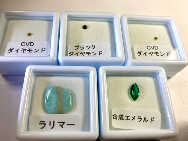 今日の戦利品は、ブラックダイアモンド、CVD合成ダイアモンド、合成エメラルド、ラリマーなど。他にも若干買いましたが、いつもより控えめとも言えそうです。