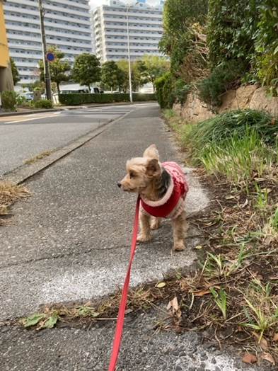 そこですぐセーターを着せ、ハーネスを付けて、いざ散歩です。