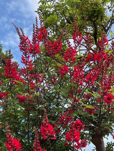 近くの公園では、アメリカデイゴの花が満開でした。細い花は交配種のサンゴシトウの特徴のようです。