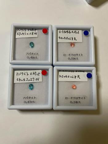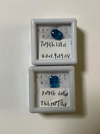 イベント最終日で安くなっていたネオンブルーのアパタイトの中から、形の違う2石を選びました。