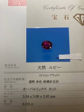 売り手がピジョンブラッドの色だと言っているだけでなく、石の種類を第三者機関で識別・評価した結果を記載した「鑑別書」にピジョンブラッドの色と記載されていることが望ましいです。