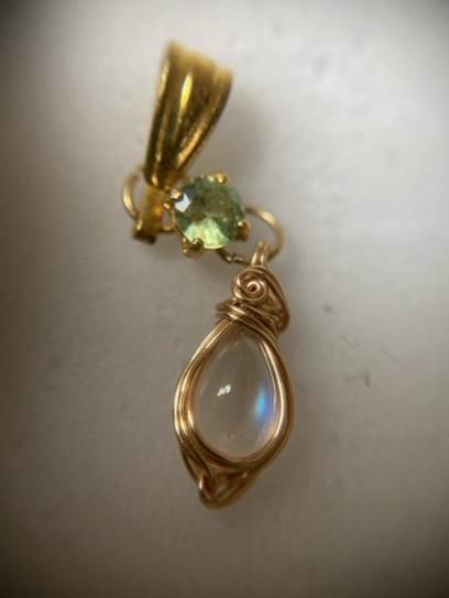 写真のペンダントトップもその一例で、ムーンストーンを主石、小粒のデマントイドガーネットを脇石としてアクセントを付けたハンドメイド作品です。