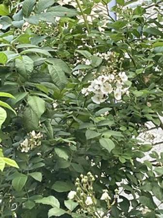 近所の庭では、ノイバラやピンクのつるバラが咲いていました。
