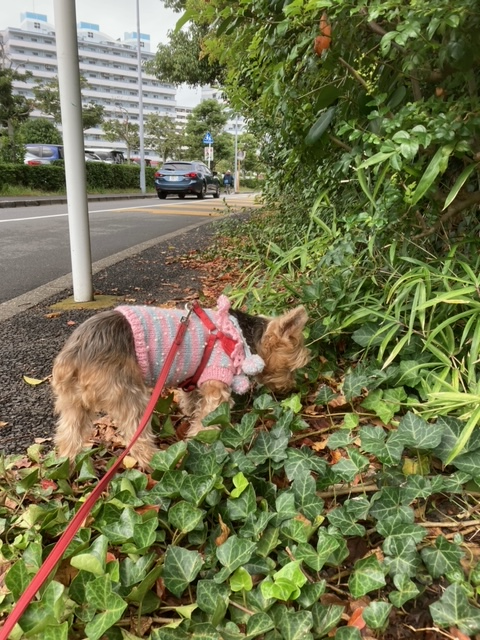 朝方だいぶ冷え込んだので、散歩は少し時間を遅らせて、ルビーはセーター装備のうえで出かけました。