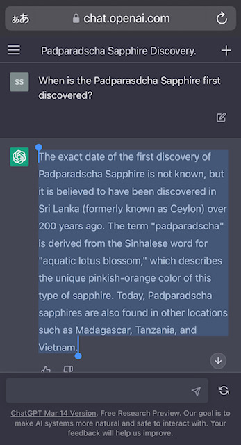 ネット上に公開されたAIである「Chat GPT」で、パパラチャの期限を聞いたところ、「不明ながら、約200年前にスリランカで発見されたとされている」との回答がありました。