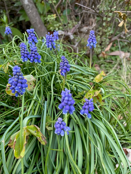 ムスカリが咲いていて、チューリップもつぼみをつけていました。