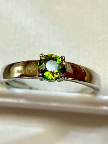 モアッサナイトとセット販売だったリング空枠を転用しました。スフェーンは軟らかく脆い石なので、爪で押さえるときに割らないよう、緊張しつつ作業しました。