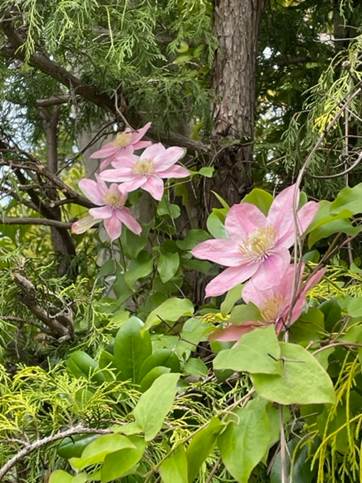 ご近所さんの庭のクレマチスも、早咲の種類なのか、もう満開になっているのがありました。