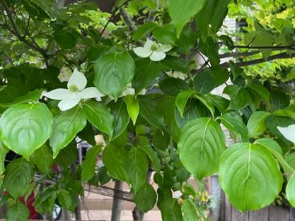 ご近所の玄関先で、ヤマボウシが控えめに花をつけていました。