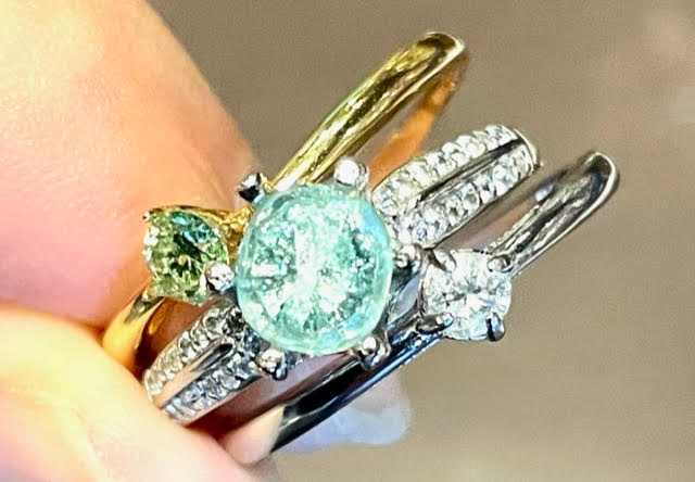 重ね付けの例として、試しに、先日作ったモアッサナイトを主石の下に隠してセッティングした「なんちゃってパライバトルマリン」に、小さなダイヤモンドの指輪2つを重ね付けしてみました。