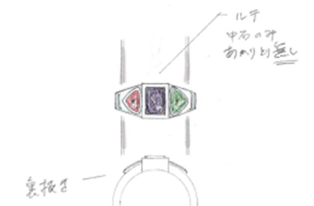 とりあえず自分用としては、メンズということで少し武骨めに、と考えて、太めのアームに石三つを一直線に配置することにしました(デザイン画参照)。