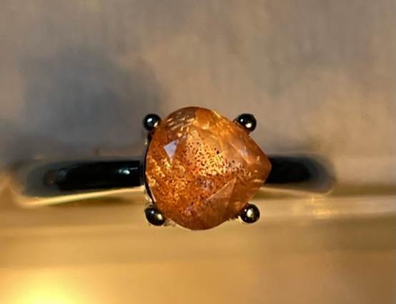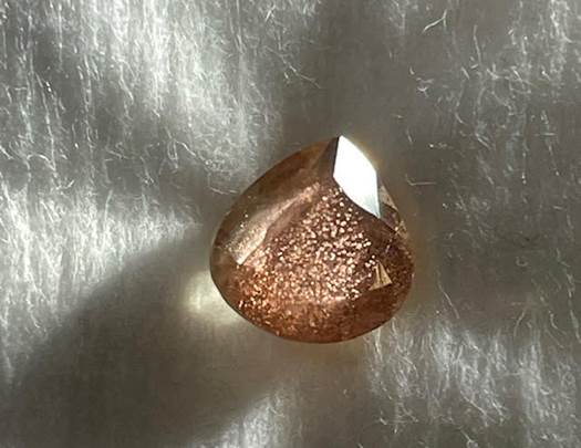 明るい褐色で、銅の微粒子を不純物として内包し、ある角度で見るとそれが一斉に光を反射して、光の壁のように見えるのが印象的な石でした。